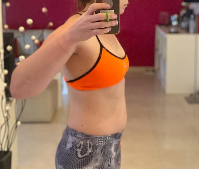 Mi reflejo en el espejo, como dije antes, de un cuerpo completamente abandonado, fue mi punto de partida. Me acuerdo de ese día como si hubiera sido ayer. Tenía puesta una calza gris horrible y un top naranja desgastado. Pasé por adelante del espejo y me vi. Era la primera vez en mucho tiempo que me veía de verdad. Busqué el celular y me saqué dos fotos: de perfil y de frente. Vi las fotos y me volví a ver al espejo.